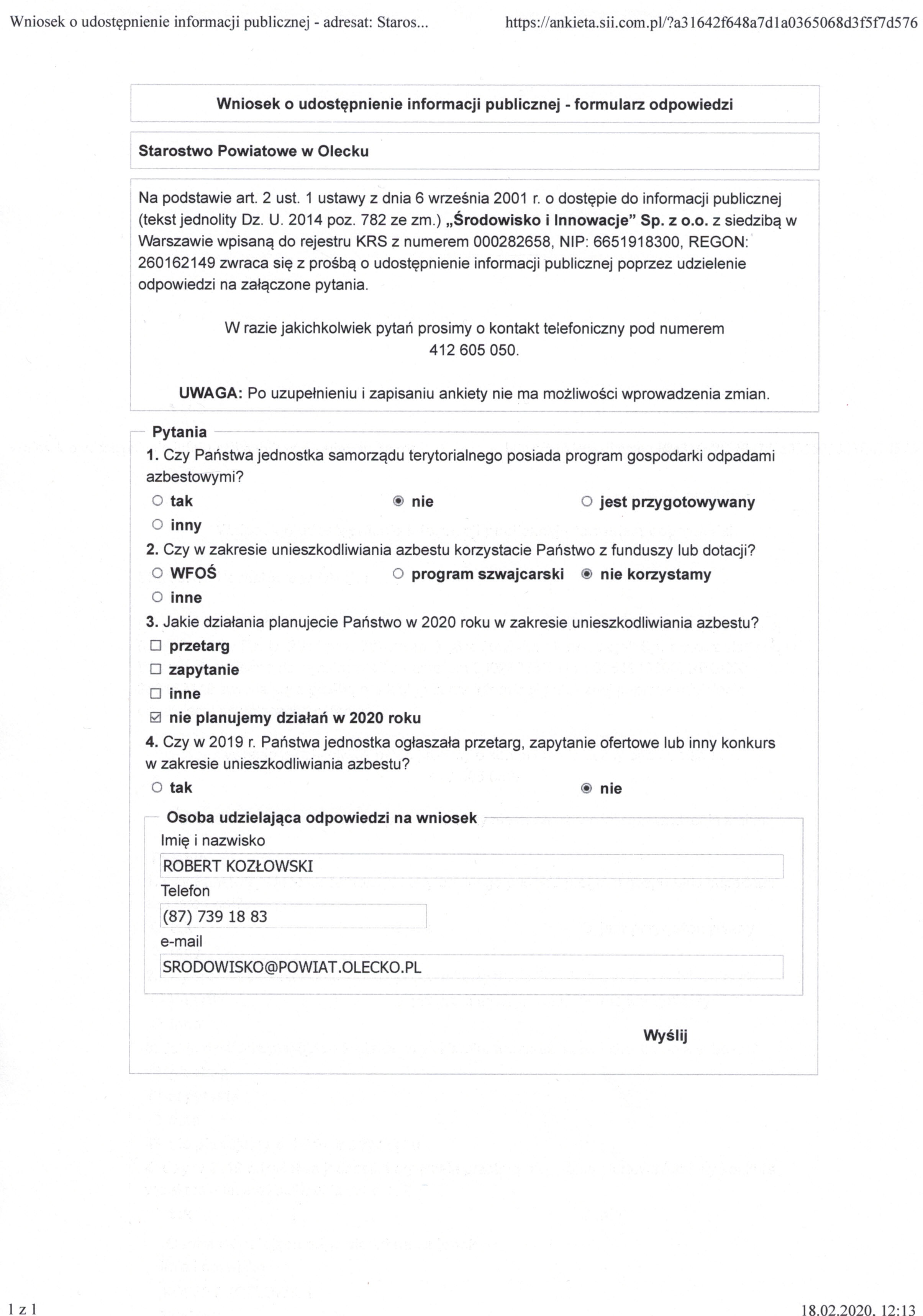 Wniosek o udostępnienie informacji publicznej dotyczący prac związanych z usuwaniem i unieszkodliwianiem azbestu w roku 2019 wniosek wraz z odpowiedzią do pobrania w załącznikach poniżej